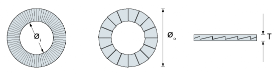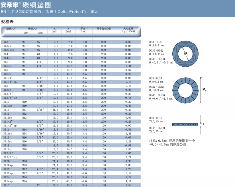 ANDI-LOCK防松墊圈提供以下材料和尺寸:碳鋼涂鋅墊圈 Delta Protekt(鋅薄片涂層 ),DL3-DL42(標準尺寸)和DL45-DL130(根據要求定制)。